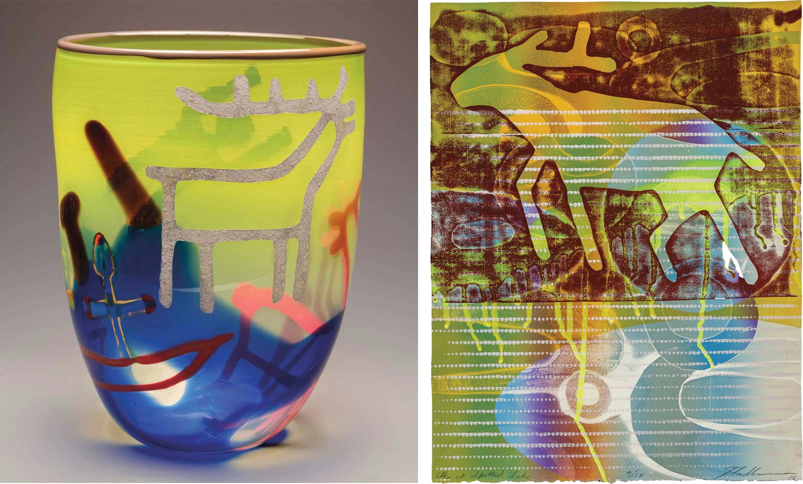 Left: High Desert Museum, Floating By, 2020, blown glass with enamel, 13 x 9¾ x 9¾ in., by Joe Feddersen (Confederated Tribes of the Colville Reservation). Collection of the artist. Courtesy studio e gallery, Seattle, Washington. Photo by Dean Davis. © Joe Feddersen. Right: High Desert Museum, Elk at Spotted Lake, 2016, relief monoprint with spray paint, 19 x 14¾ in., by Joe Feddersen (Confederated Tribes of the Colville Reservation). Hallie Ford Museum of Art, Willamette University, Salem, Oregon. Gift of the artist 2019.009.005. Photo by Dean Davis. © Joe Feddersen.