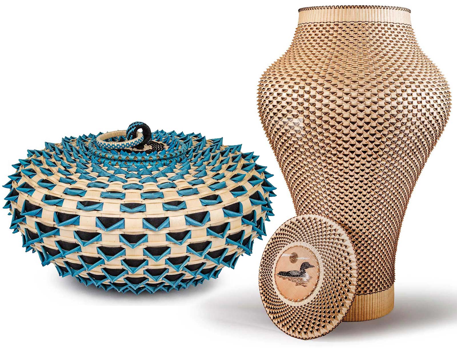 Left: Bruce Museum, Blue Point Urchin, 2016, ash, sweetgrass and dye, 5 x 9 x 9 in., by Jeremy Frey (Passamaquoddy). Collection of Dr. and Mrs. Ari and Lea Plosker. © Jeremy Frey. Image courtesy Eric Stoner. Right: Bruce Museum, Loon, 2015, ash, cedar bark, porcupine quill on birch bark and dye, 19 x 10 x 10 in., by Jeremy Frey (Passamaquoddy). Collection of Dr. and Mrs. Marc Appelbaum, New Mexico. © Jeremy Frey. Image courtesy Eric Stoner.