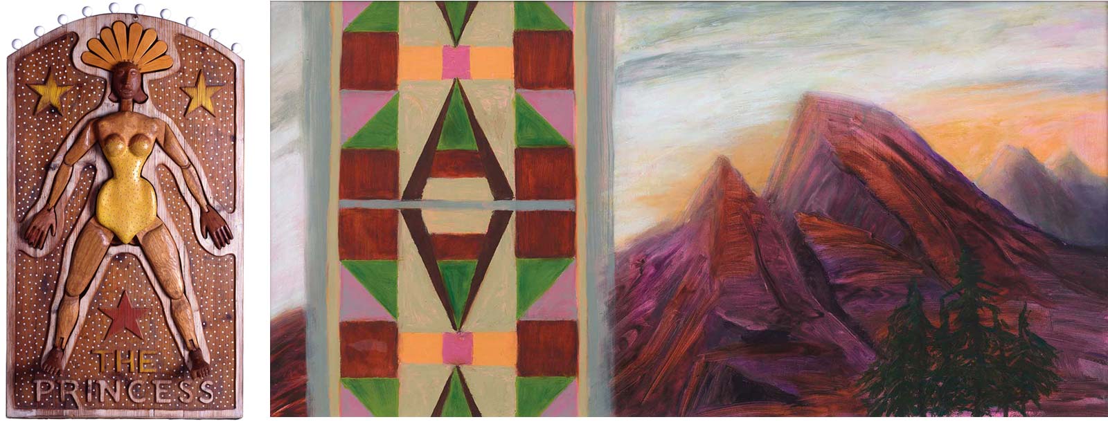 Left: Heard Museum, Indian Princess, 1983, wood, metal, ceramic, paint, 49¼ x 28¼ x 7½ in., by Bob Haozous (Warm Springs Chiricahua Apache). Gift of Dr. Rennard Strickland. Right: Heard Museum, Our Land Variation II, 2008, oil stick on paper, by Kay WalkingStick (Cherokee). Miller Meigs Collections. Photo by JSP Art Photography.