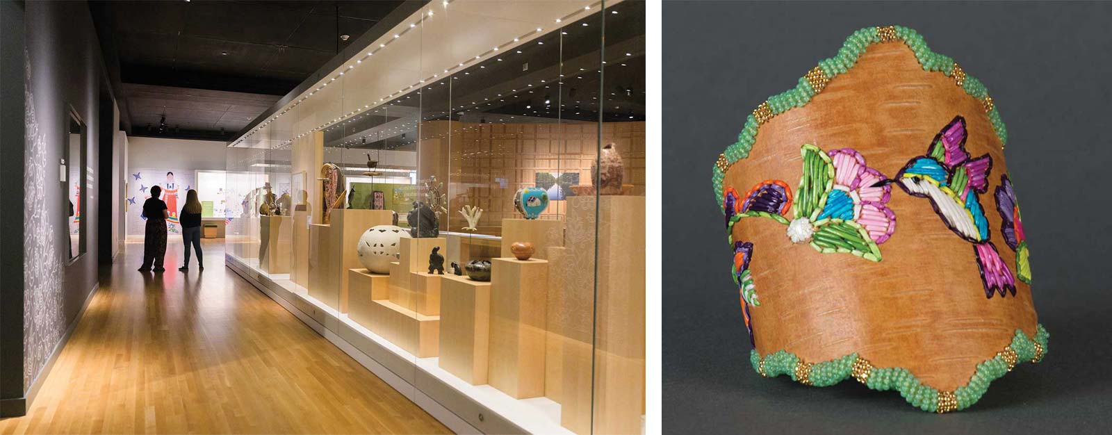 Left: The Eiteljorg Museum’s Native American art galleries, featuring the ongoing exhibition Expressions of Life: Native Art in North America. Right: Eiteljorg Museum, Nagamo “She Sings”, 2019, birch bark with naturally and commercially dyed porcupine quills, size 12 vintage Italian glass beads, size 13 24k gold-plated Charlotte true cut seed beads and smoked buckskin, by Monica Jo Raphael (Anishinaabe/Sičaŋgˇu Lakota). Collection of the Eiteljorg Museum of American Indians and Western Art 2019 Eiteljorg Museum Indian Market and Festival Harrison Eiteljorg Purchase Award.