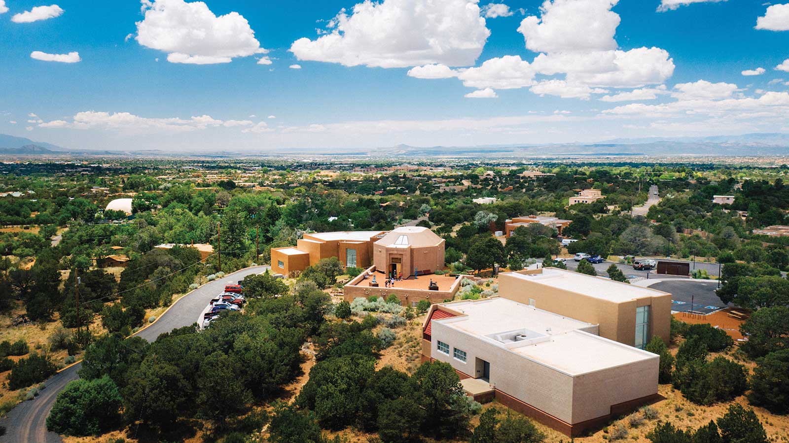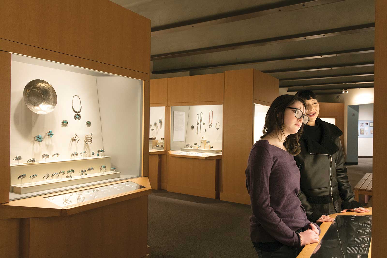 On the museum’s landscaped grounds, visitors will find works by sculptors Melanie Yazzie (Navajo) and Alan Houser (Chiracahua Apache, 1914-1994,) and the plaza offers beautiful views. Visitors enter the historic museum building (echoing the Navajo hooghan) through the door facing east.