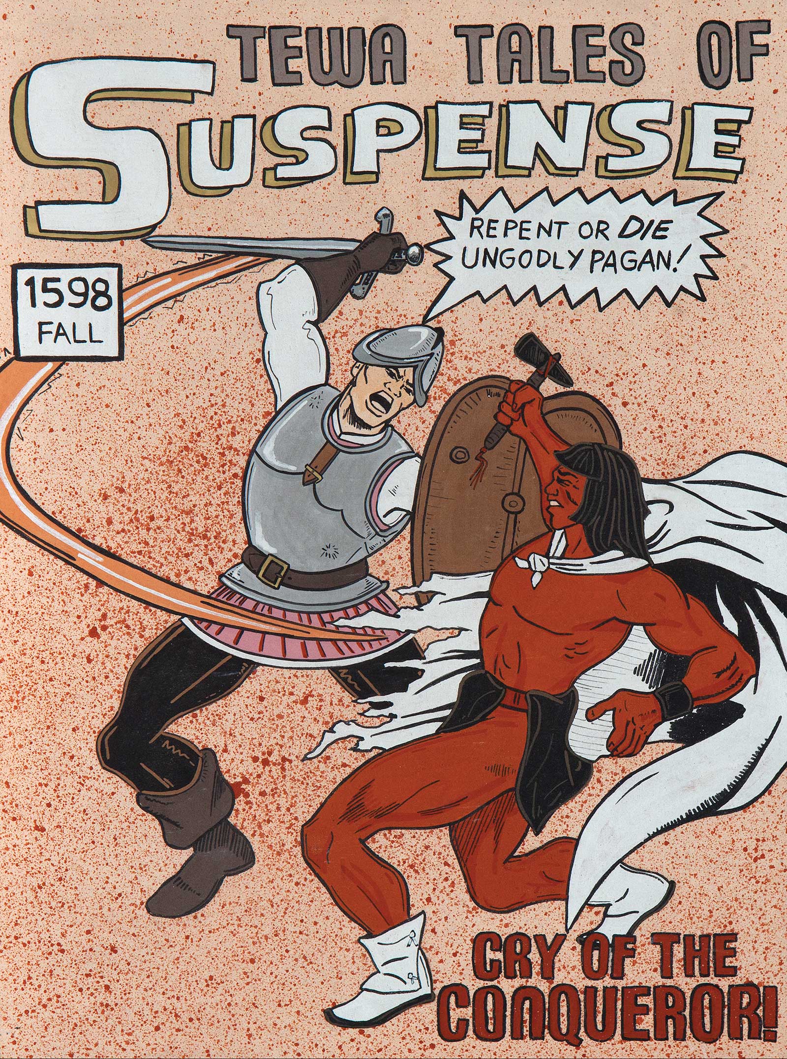 Philbrook Museum of Art, Cry of the Conqueror, Tewa Tales of Suspense #14, 2012, ceramic tile, paint, 11 x 8¼ x ¼ in., by Jason Garcia (Santa Clara Pueblo).