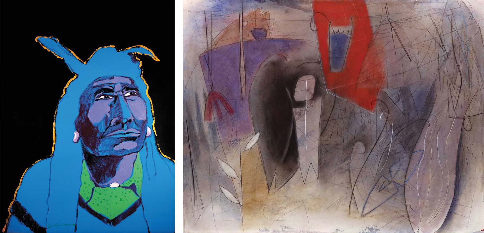 Left: Maynard Dixon & Native American Art Museum, Night Indian, acrylic on canvas, 40 x 30 in., by Fritz Scholder (Luiseño, 1937-2005). Right: Maynard Dixon & Native American Art Museum, Treading Between the Horns, ca. 1989, oil on paper on canvas, 38¼ x 50 in., by Emmi Whitehorse (Navajo (Diné)).