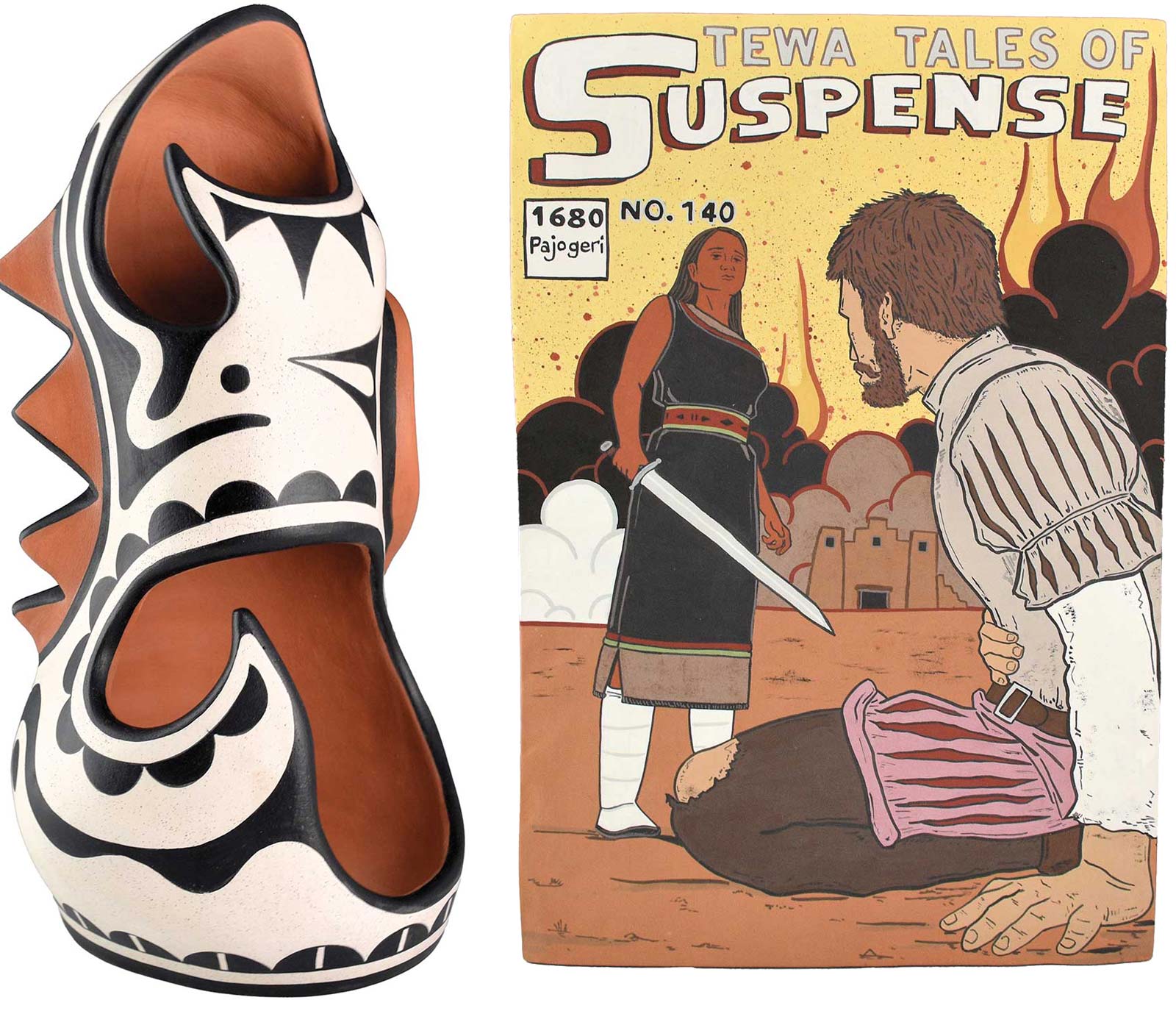 Left: Jeff Suina (Cochiti Pueblo), The Winds of Time, native clay Right: Jason Garcia (Santa Clara Pueblo), Tewa Tales of Suspense #140, native clay, native clay slips