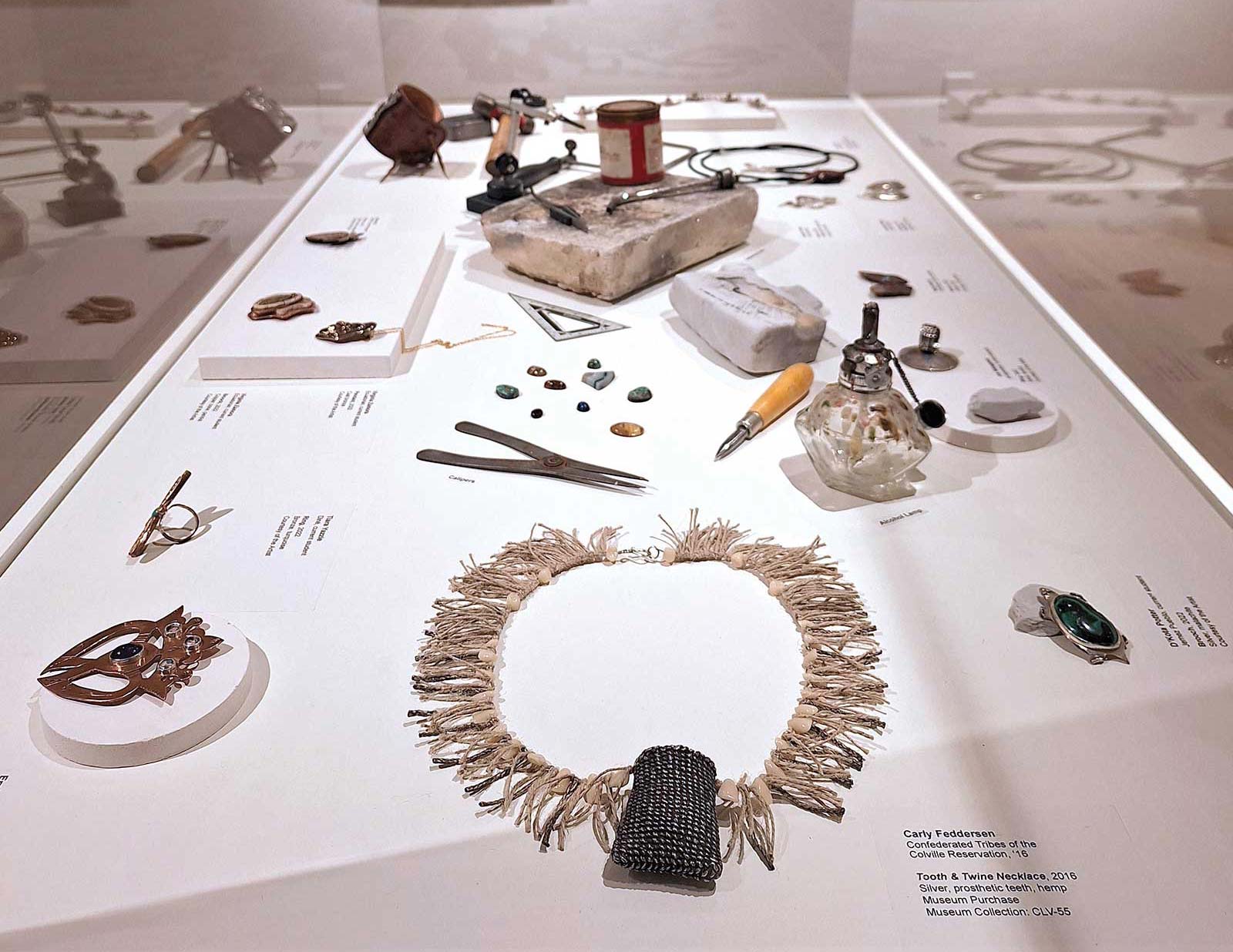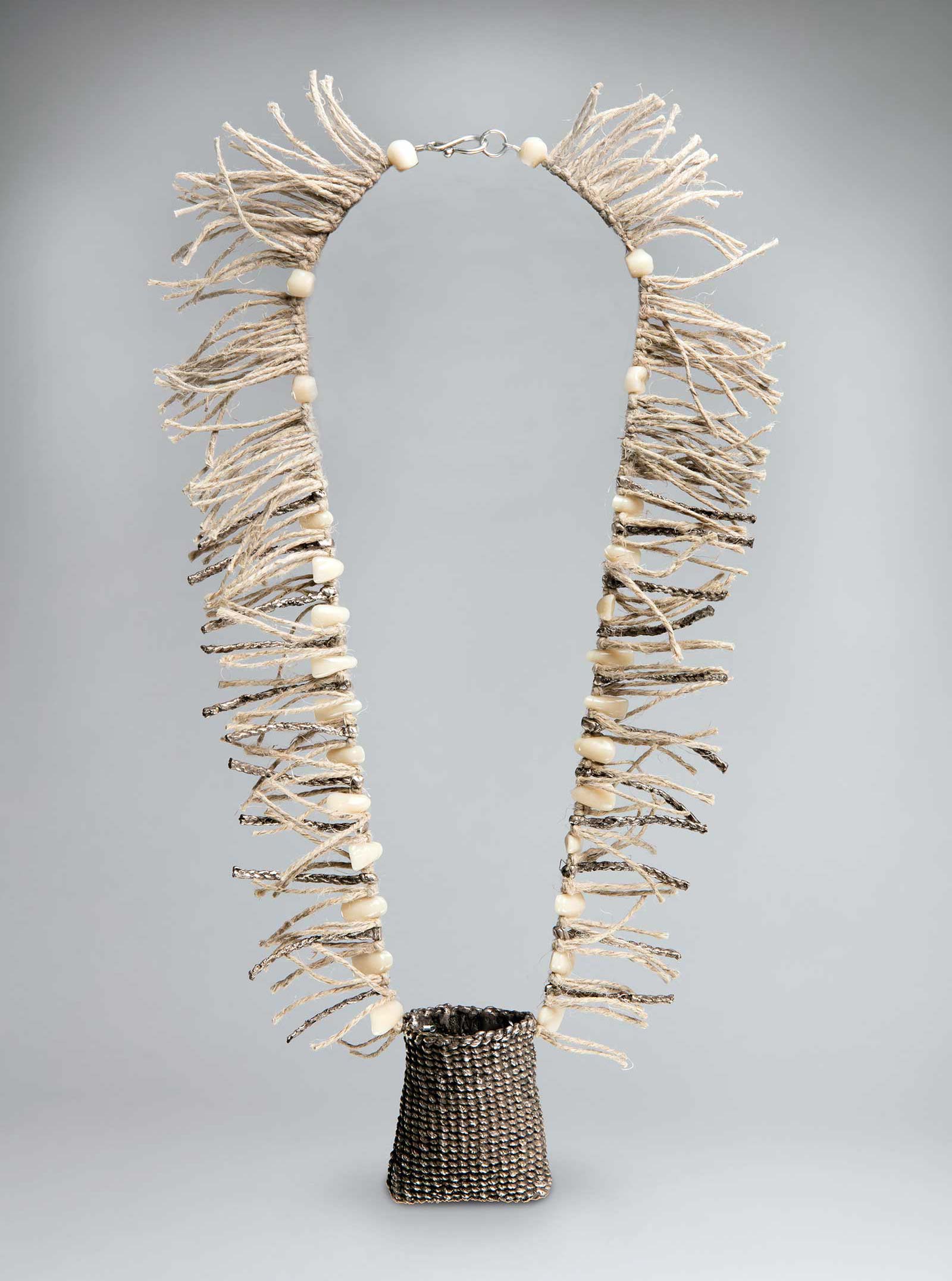 Carly Feddersen (Colville), Tooth & Twine Necklace, 2016, silver, prosthetic teeth, hemp. CLV-55; IAIA Museum Purchase, 2016; Courtesy of the IAIA Museum of Contemporary Native Arts, Santa Fe, NM. © Carly Feddersen. Photograph by Addison Doty.