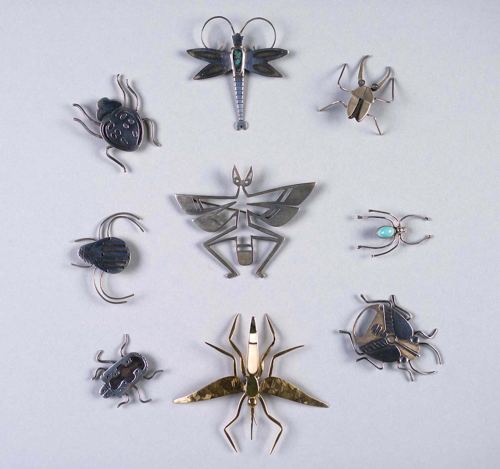 Bug Pins, various mediums and dimensions. [Clockwise from Top Center: Raymond Martinez (Ohkay Owingeh), SJ-19; Sam Leader Charge (Brulé Sioux), S-41; James Tenorio (Santo Domingo), SD-41; Dennis Apple (Sioux), S-89; Veronica Orr (Colville/Lytton), J-7; Christine McHorse (née Nofchissey, Diné), N-270; Peter Mesteth (Sioux), S-54; Carolyn Suina (Chochiti), CO-12; Jack Turquoise (Diné), N-273.] Courtesy of the IAIA Museum of Contemporary Native Arts, Santa Fe, NM. Copyright held by the artists. Photograph by Eric Wimmer