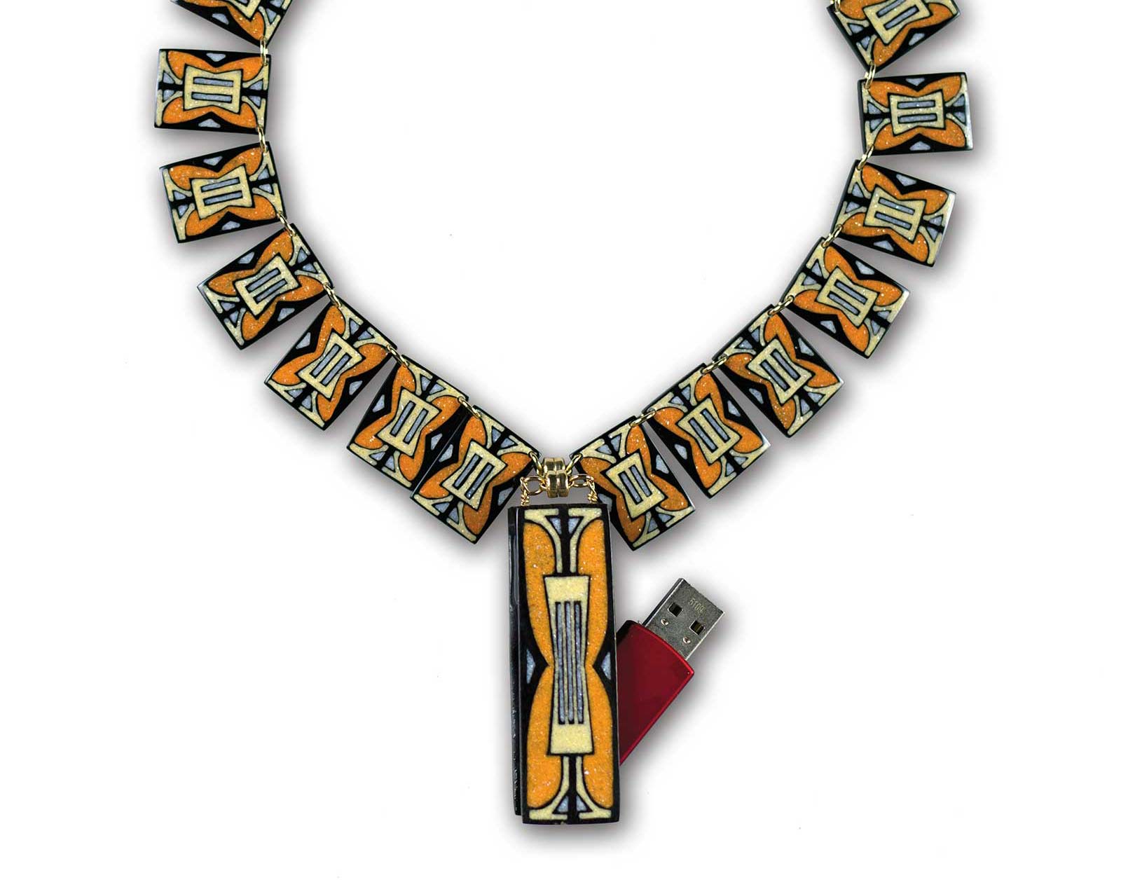 Kevin Pourier (Oglala Lakota), 4 Generations and 4 Gigs of Memory, 2014, buffalo horn inlay with orange sandstone, yellow sandstone, mother-of-pearl; 4 GB flash drive. S-339; IAIA Artist-in-Residence Purchase, 2021; Courtesy of the IAIA Museum of Contemporary Native Arts, Santa Fe, NM. © Kevin Pourier. Photograph by Eric Wimmer.