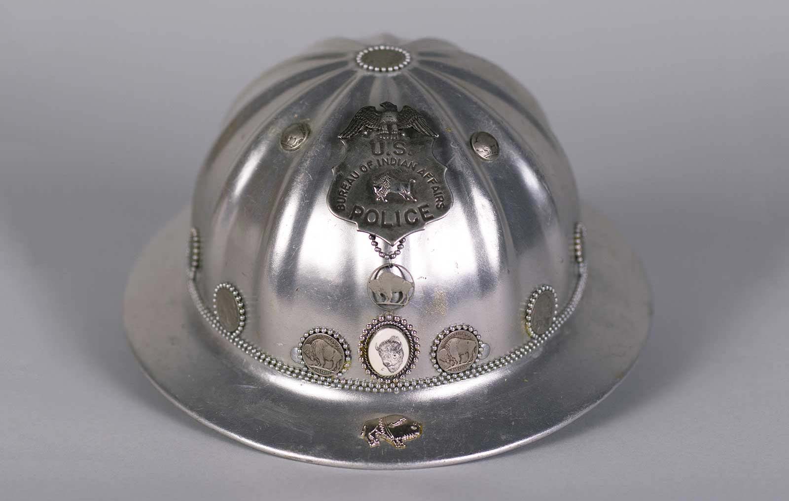 Richard Glazer Danay (Mohawk), Indian Police Headdress, 1999, silver, steel, aluminum. MH-34; Gift of David Bradley, 2019; Courtesy of the IAIA Museum of Contemporary Native Arts, Santa Fe, NM. © Richard Glazer Danay. Photograph by Eric Wimmer.