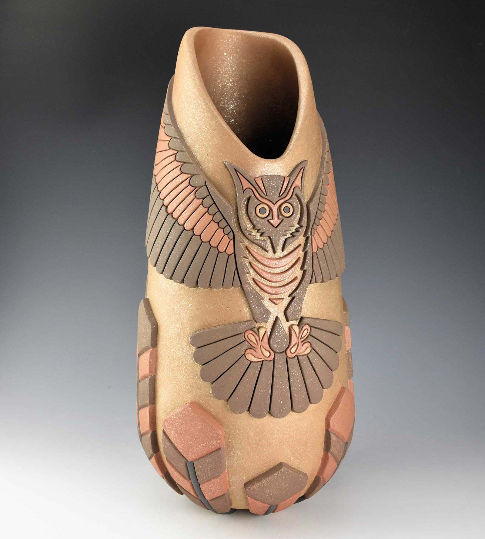 Animals are also prevalent in Begay’s work in the show—one features a stag as seen in A Walk into the Canyon, and the other a bull in Flight. And in Santa Clara Pueblo artist Sergio Lugo’s polychrome jar Guardian, we see an owl taking to the sky.