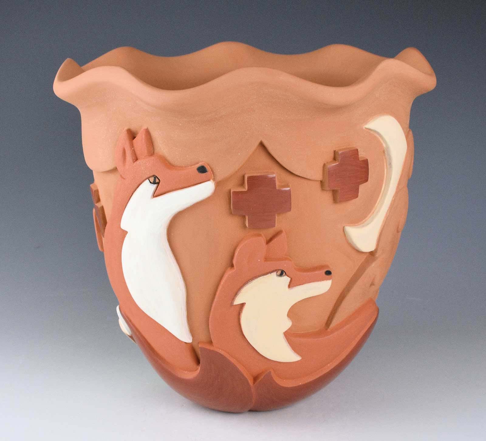 Santa Clara Pueblo artist Borts-Medlock’s Foxes and the Moon features two red foxes gazing up at a crescent moon. The design along the pot is made up of three-dimensional forms that jut out from the vessel itself.
