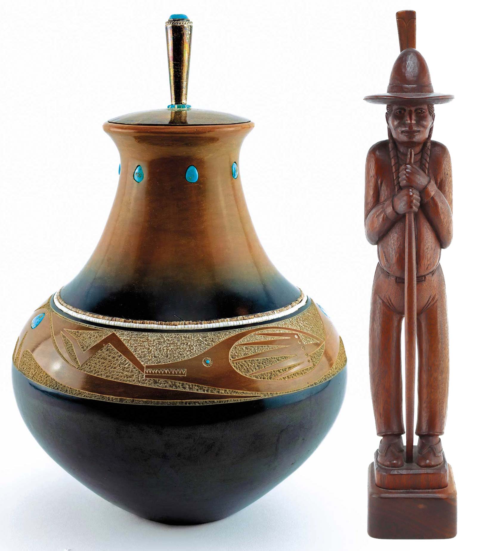 Left: Tony Da (San Ildefonso, 1940-2008), black and sienna sgraffito vase with turquoise inlay, Heishi inclusions and Avanyu design, ca. 1970s, 121/8 x 8 in. Right: Willard Stone (Cherokee, 1916-1985), Cherokee Cornstalk Shooter, 1961, wood carving, 19¼ x 4 x 3¼ in.