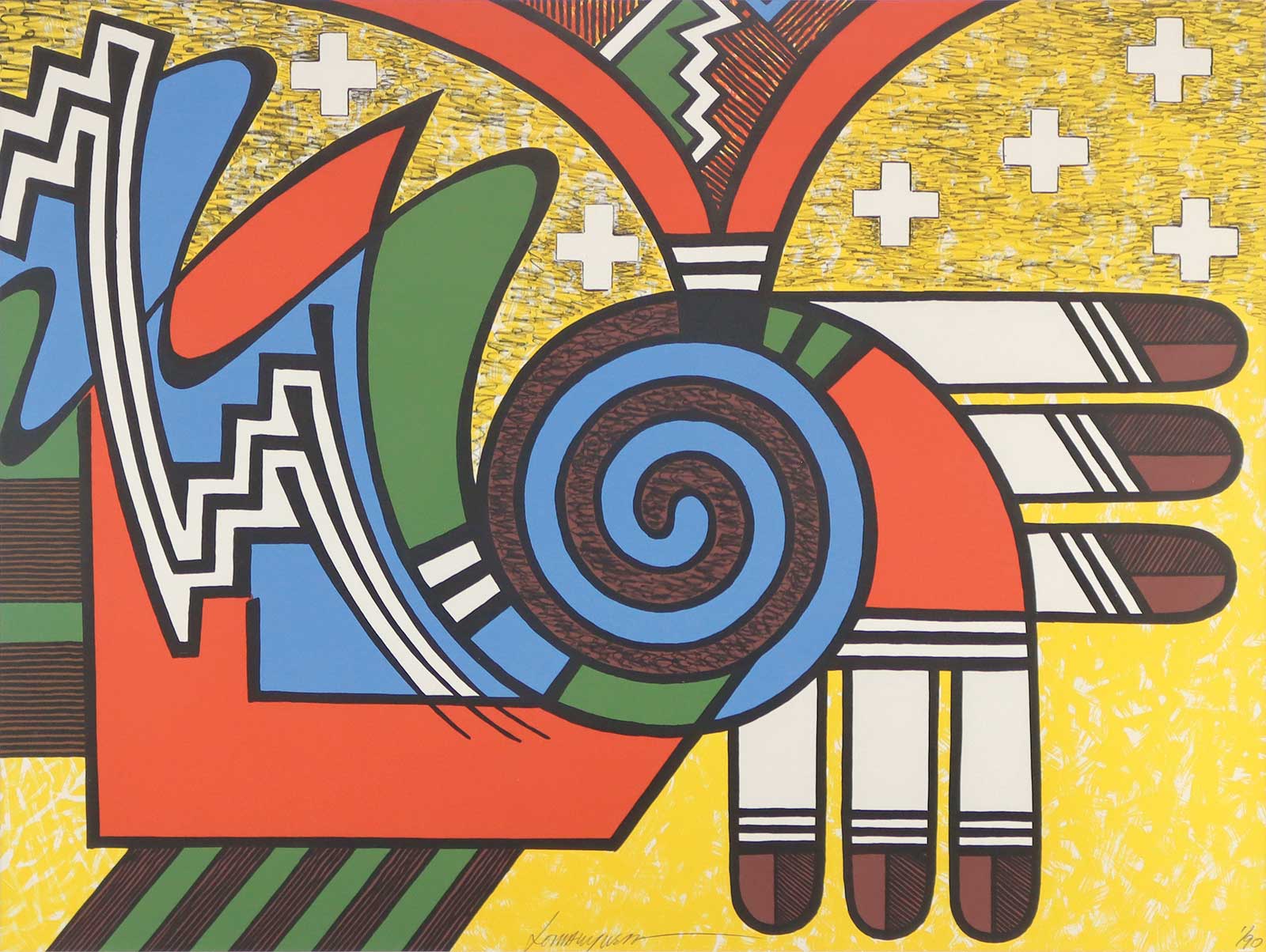 Michael Kabotie (Lomawywesa) (Hopi, 1942-2009), Mother Earth Father Sky, lithograph, ed. 1 of 90, 18 x 24 in.
